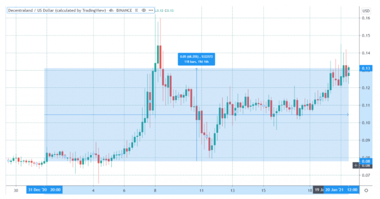 Mana topped out at $0.114 after falling short of the august 2020 high of $0.134.